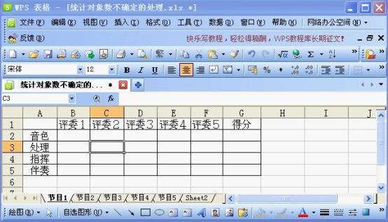 打开WPS表格,新建空白文档,在“节目1”工作表中录入数据,计算各评委对某节目各内容的评分,假定5位评委、评定4个内容,如图1所示。