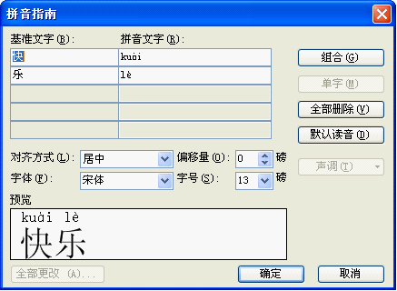 单击“组合”命令按钮,单击拼音文字下的输入框,输入汉字“快乐”代替拼音,修改字号为14磅