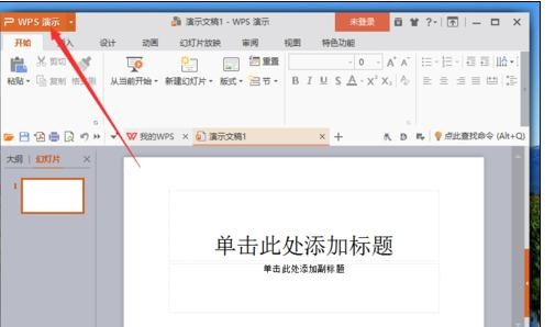二、在打开的wps演示窗口中,点击左上角的“wps演示”命令选项。如图所示;